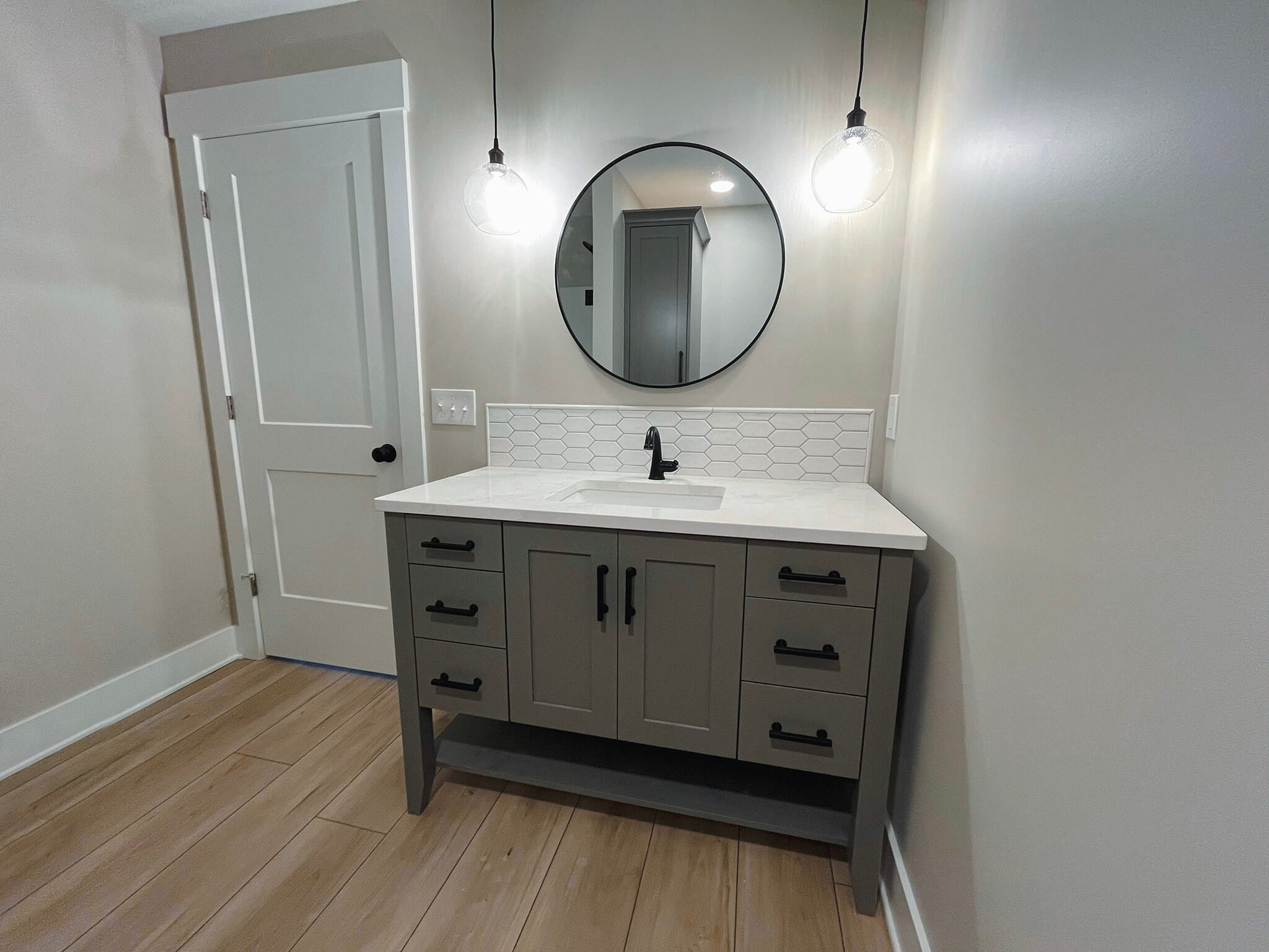 We designed and crafted a large (almost 20') entertainment center, kitchenette, bathroom vanity and linen cabinet to finish off this homeowner's basement.