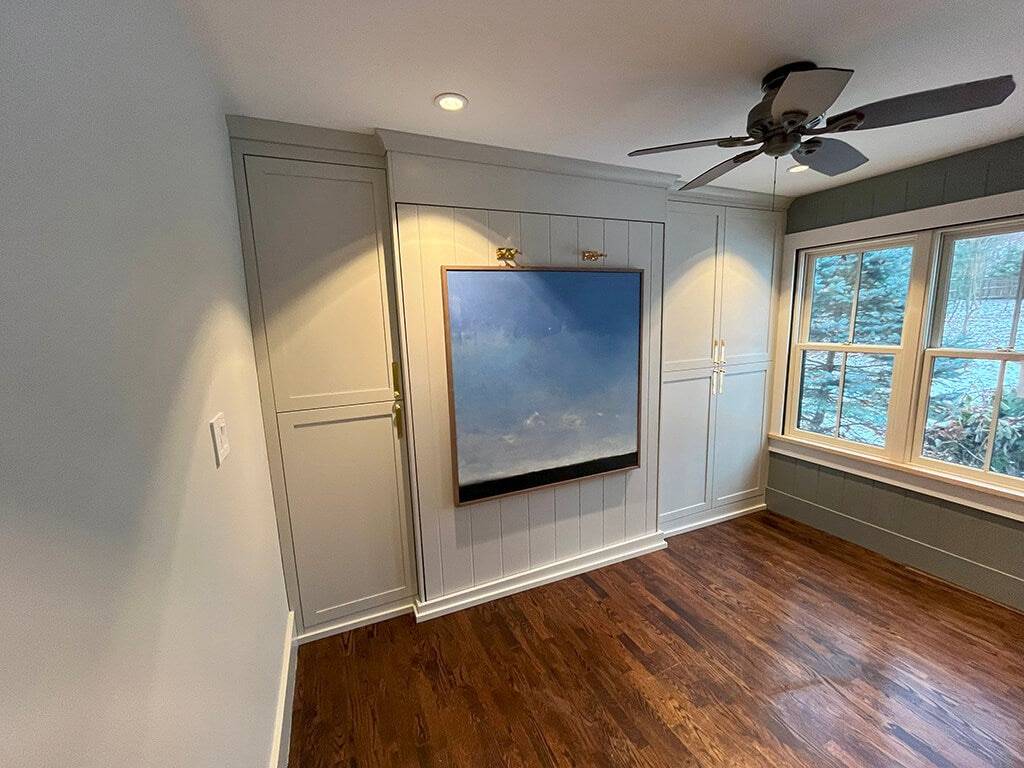 Would you guess that there is a murphy bed built into this wall? Our wall-to-wall and floor-to-ceiling custom cabinetry beautifully houses a hidden murphy bed, providing the homeowners with both form and function.