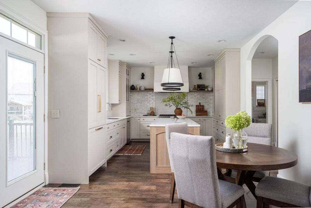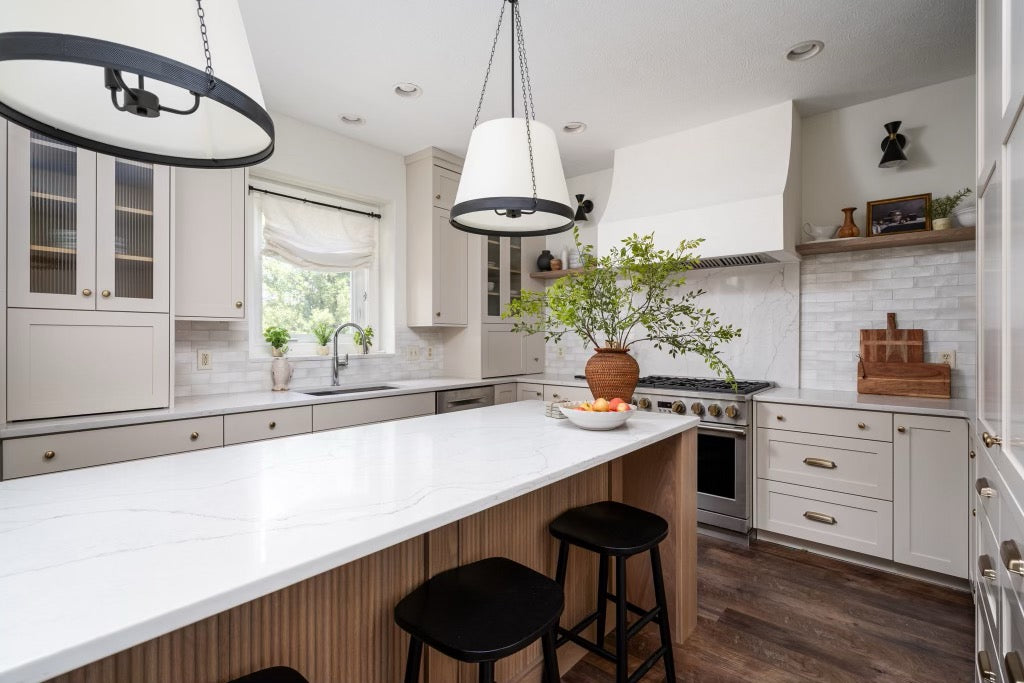 The brass hardware pairs beautifully with both wood tones and painted cabinetry, with the neutral color palette creating a warm and inviting space.